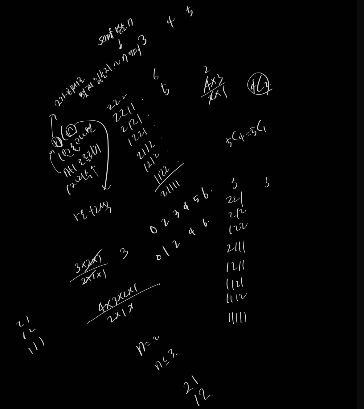 보시면 2가 3개인 경우 1개, 2가 2개고 1이 2개인 경우 6개, 2가 1개고 1이 4개인 경우(5개일 것이므로 생략했음)를 적어놓았는데요. 위에 적어놓은 바에 따르면 n=6일때, k=5일때의 답은 1+6+5로 12개가 나와야 합니다.
