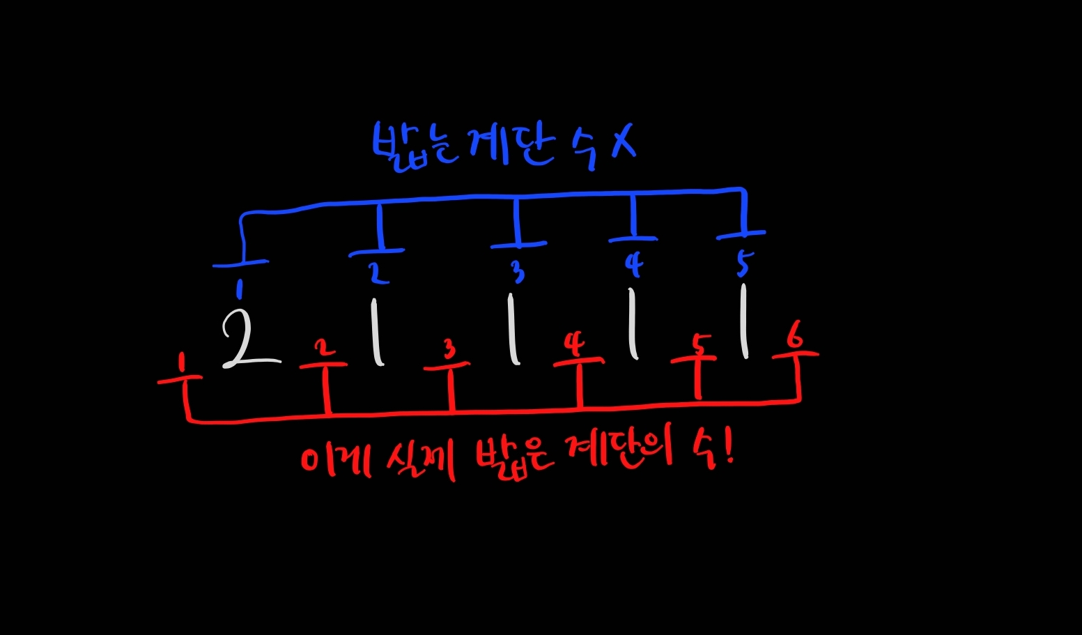 즉, n2의 진짜 의미란 ( 계단을 최대한 적게 밟고 올라가는 수 - 1 )이 되는 것이죠.