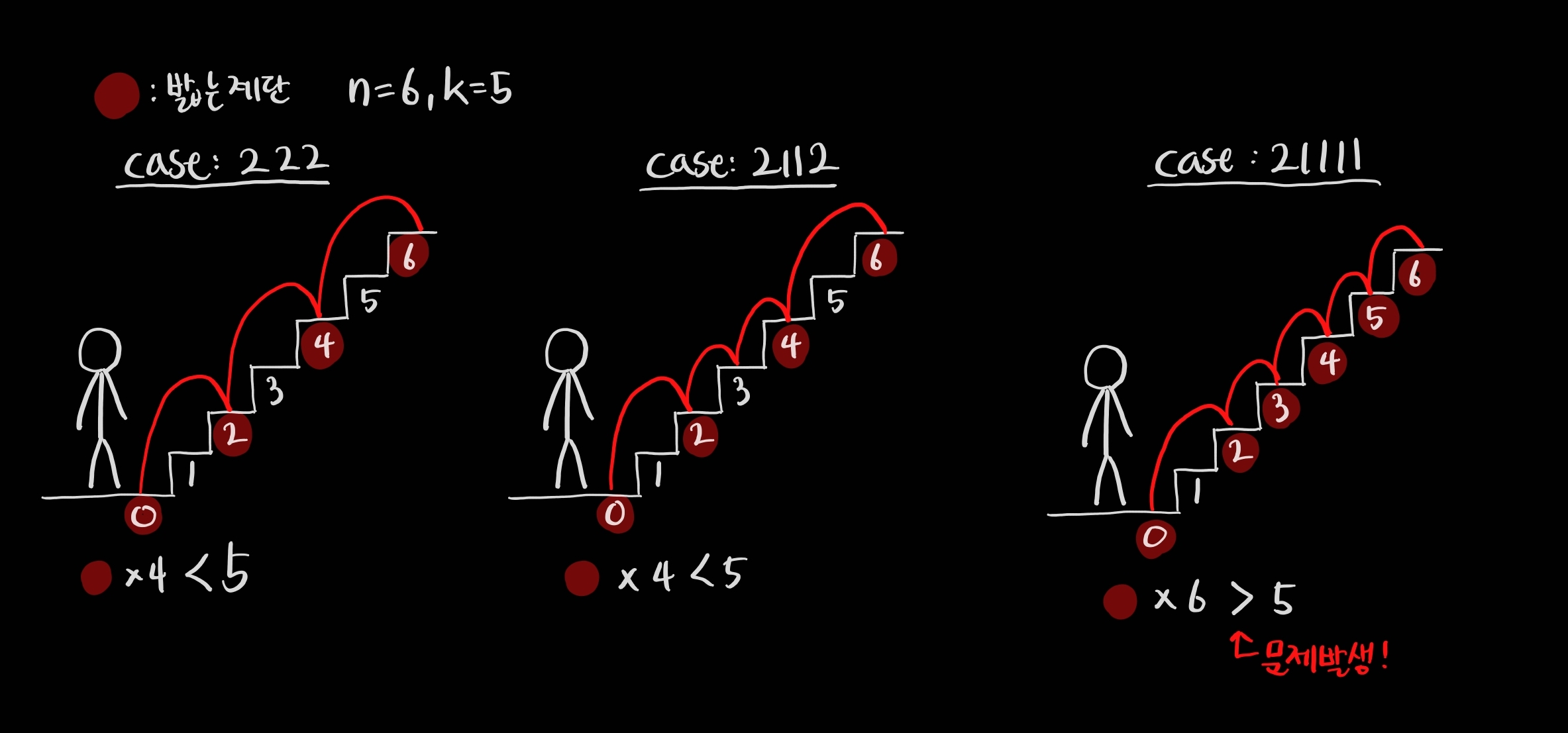 위 그림과 같이 21111은 0번째 계단(바닥)까지 포함하여 총 6계단을 밟고 올라가는 것이 되기 때문에, 5인 k의 값보다 더 커지게 되어 문제가 생기게 되었던 것입니다.