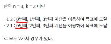 그러나 각 자리의 2와 1의 합이 n이 된다는 것은 k개 이하의 계단을 밟는 것이 아닌, n개의 계단을 오르기 위한 조건이었습니다.