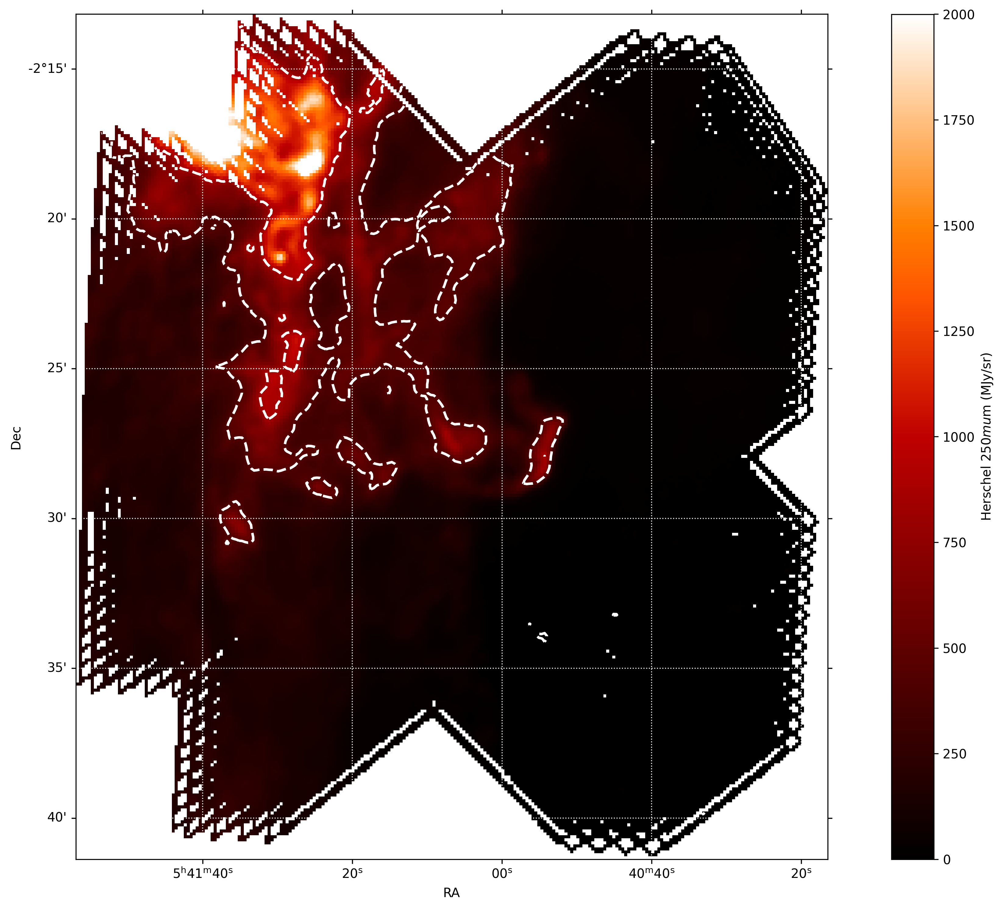 plt.contour(hdu.data, linewidths=2, colors='white', linestyles="--", levels=levellinter) plt.savefig('C:\\Users\\user\\Downloads\\IC434-2.png', bbox_inches='tight', pad_inches=0.1, dpi=300)