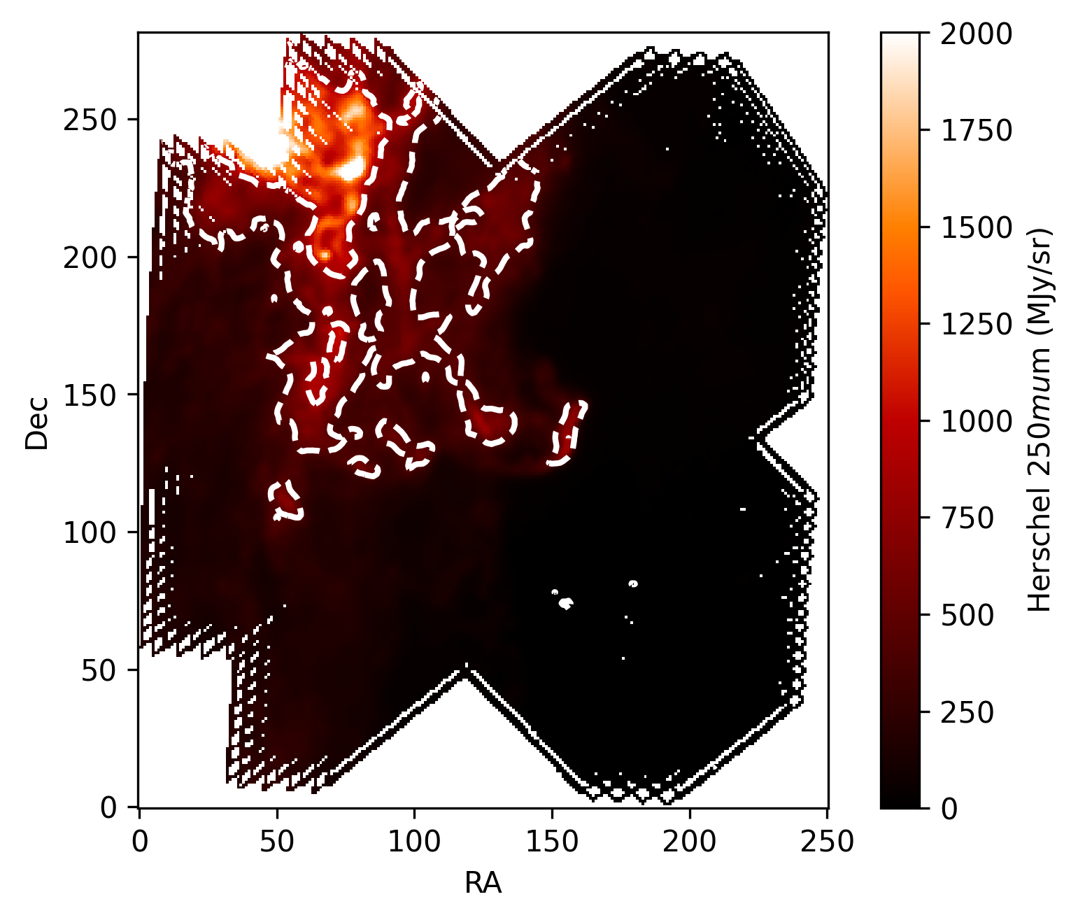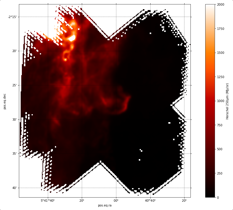 plt.colorbar(bar, label='Herschel 250$mu$m (MJy/sr)')