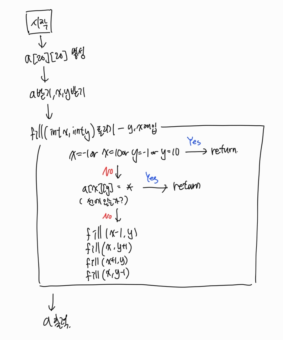 ▽문제 바로가기 https://codeup.kr/problem.php?id=2610 그림판 채우기 $10*10$ 크기의 그림이 있다. 이 그림에 그림판 색 채우기 기능을 구현하시오. (단, 원점은 왼쪽 위 끝이고, $x$ 값은 오른쪽, $y$ 값은 아