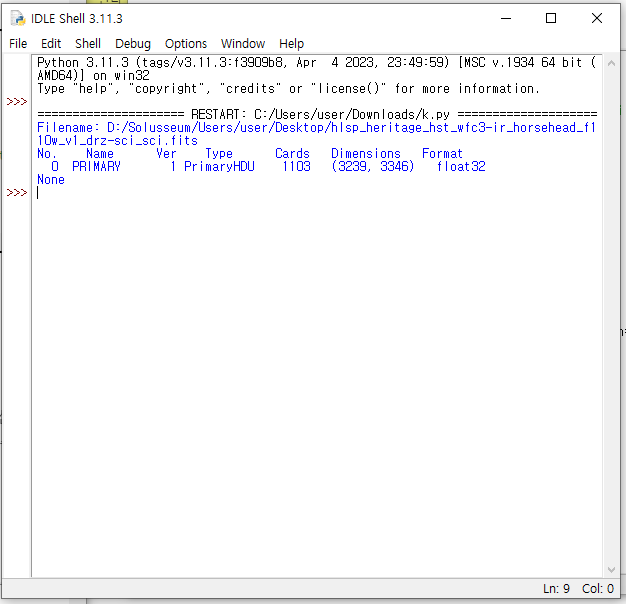 출력을 하면 이런 창이 뜨는데요. 여기서 PrimaryHDU에 2차원 정보가 저장되어 있기 때문에, 우리는 저것을 이용하여 사진을 만들 겁니다.