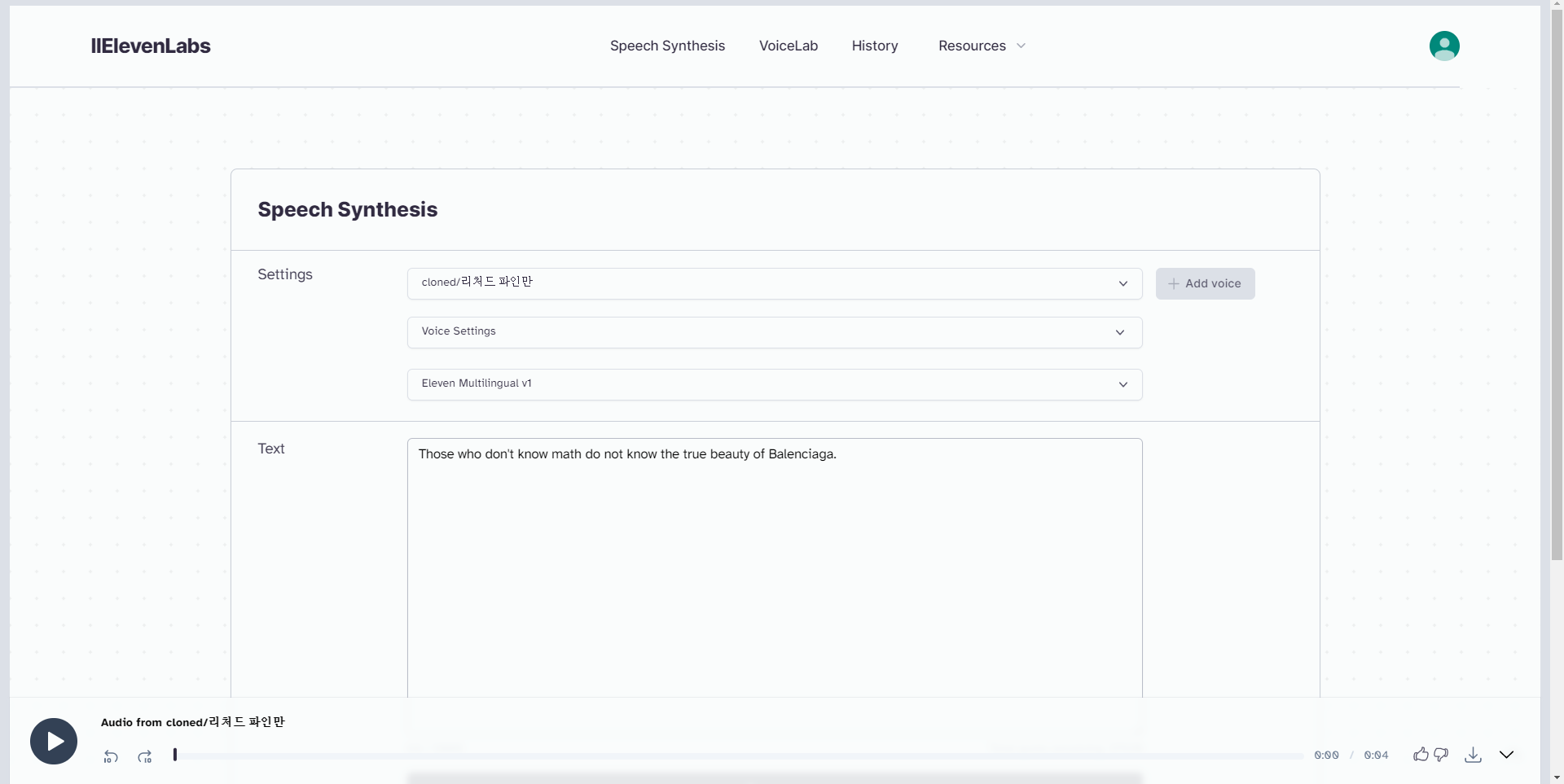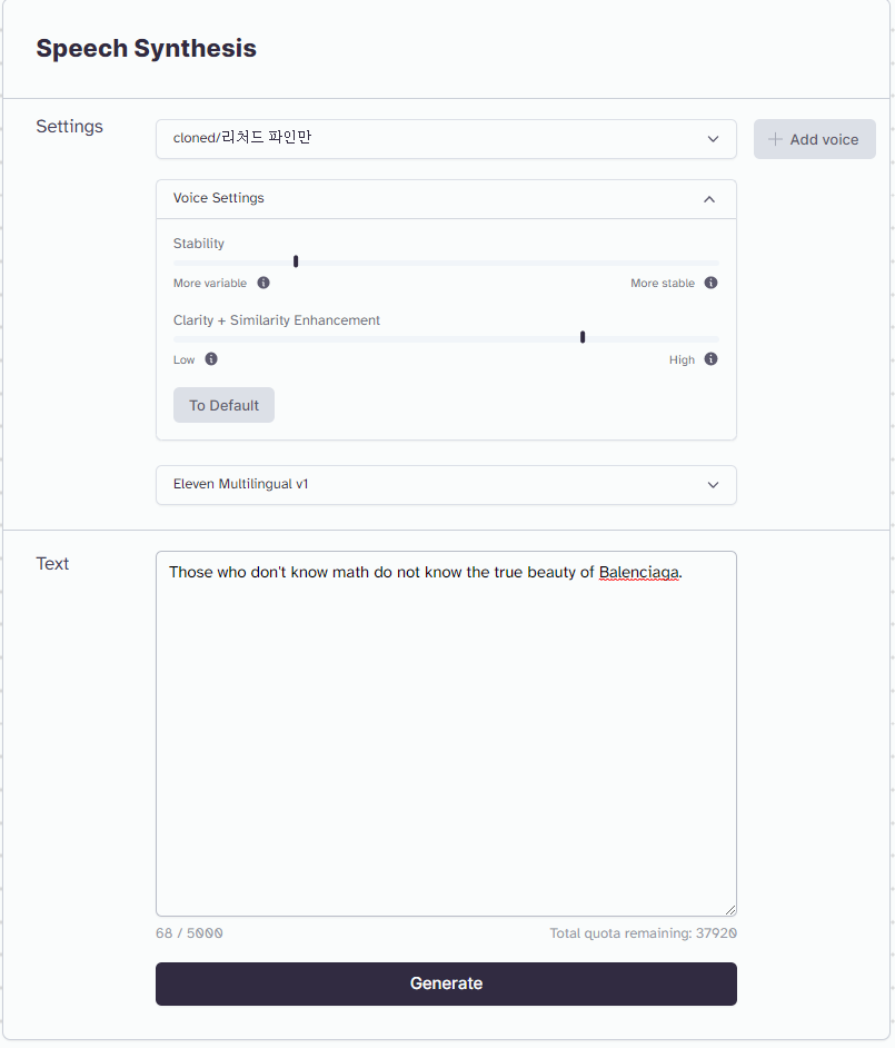 text에 원하는 대사를 넣으면 그 사람의 목소리와 비슷하게 저 대사를 읽어줍니다.