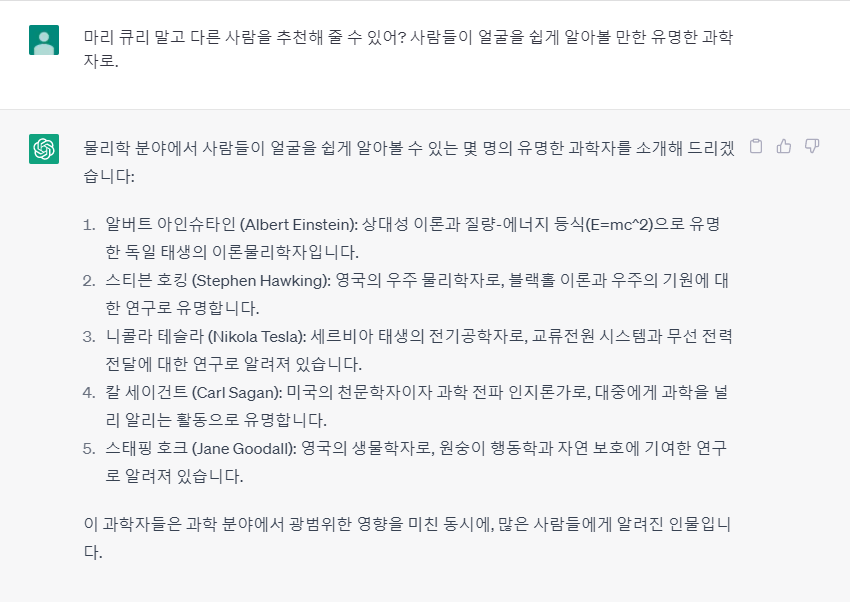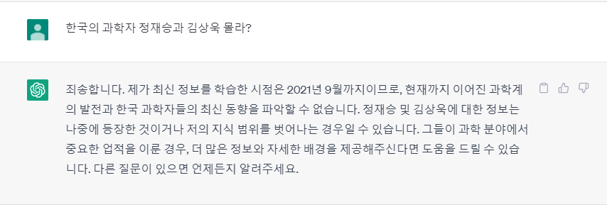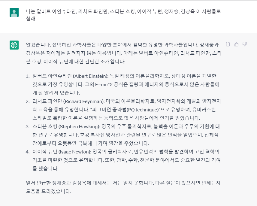 챗지피티가 정재승 교수님과 김상욱 교수님을 모른다고 답한 것이었습니다.