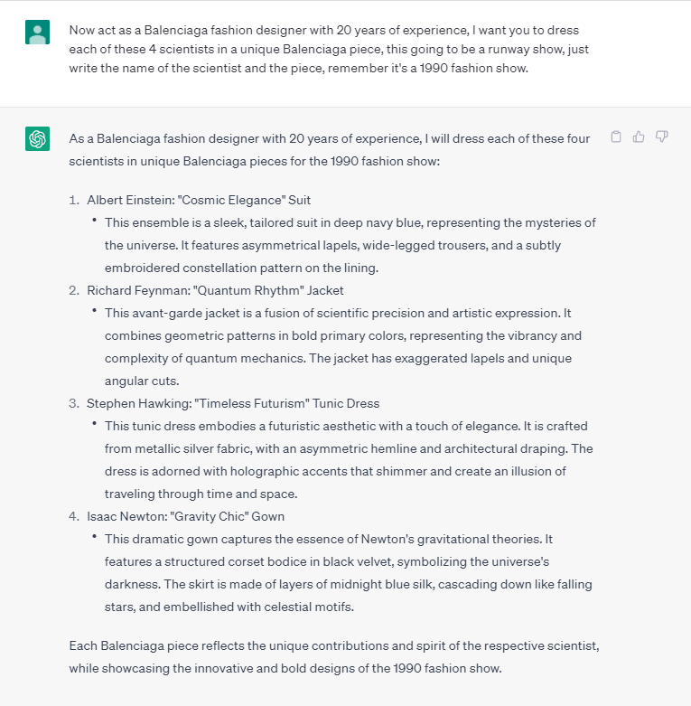 이제 본격적으로 옷을 추천받을 차례인데요. 위에 올려둔 영상에서 챗지피티에게 입력한 것을 조금 수정하여 입력해 보았습니다. 대충 20년 경력의 발렌시아가 디자이너로서 90년대 느낌으로 스타일링 해줘라~ 라는 뜻입니다