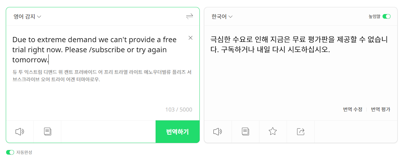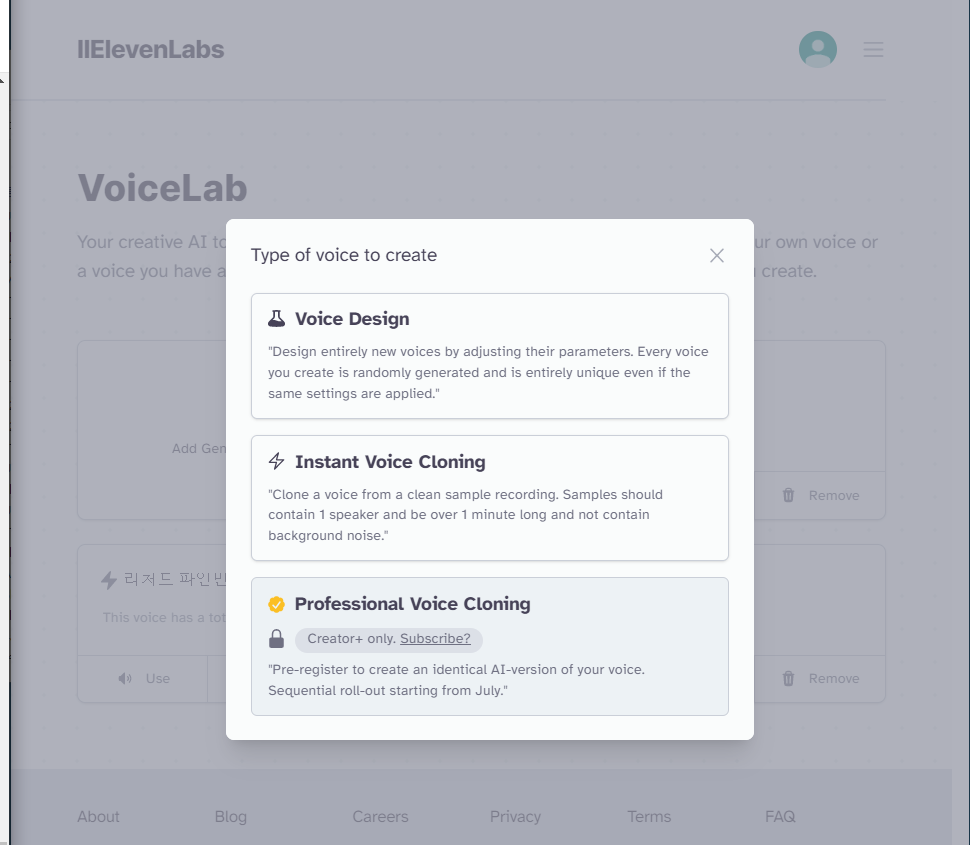 참고로 일래븐랩스에서도 다운받은 mp3파일을 이용해서 목소리를 만드는 것은 유료입니다. 대신 처음으로 한 달 유료버전을 결제하는 경우에는 원래 5달러였던 가격이 할인되어 1달러면 한달간 사용이 가능합니다. 1달러면 요즘 환율로 1300원 정도니까 생각보다 비용이 부담되지는 않는 것 같아요.