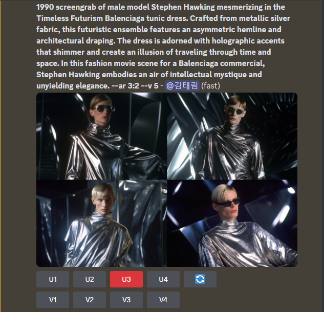 그래서 바로 그 궁금증을 해결해 보기 위해 위의 prompt를 토씨 하나 안 바꾸고 그대로 복사하여 현재(2023.05.29) 미드저니에 넣어 보았습니다.