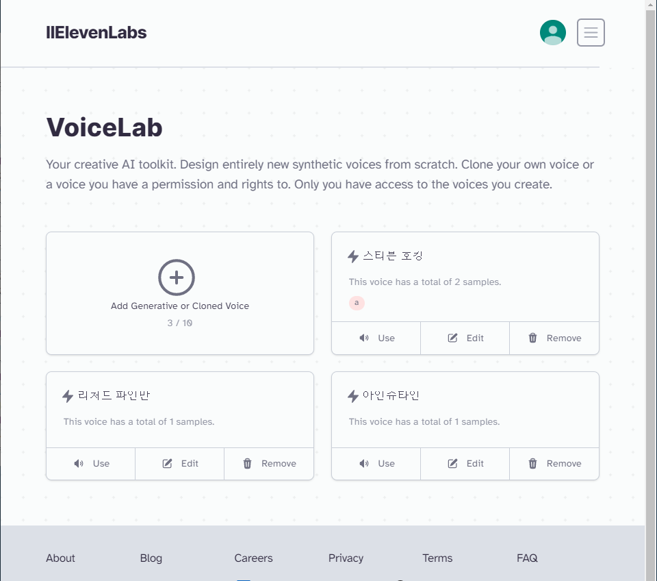 이건 로그인 후 화면이고요. 상단 가운데에 있는 VoiceLab이라는 곳을 클릭해 줍니다.