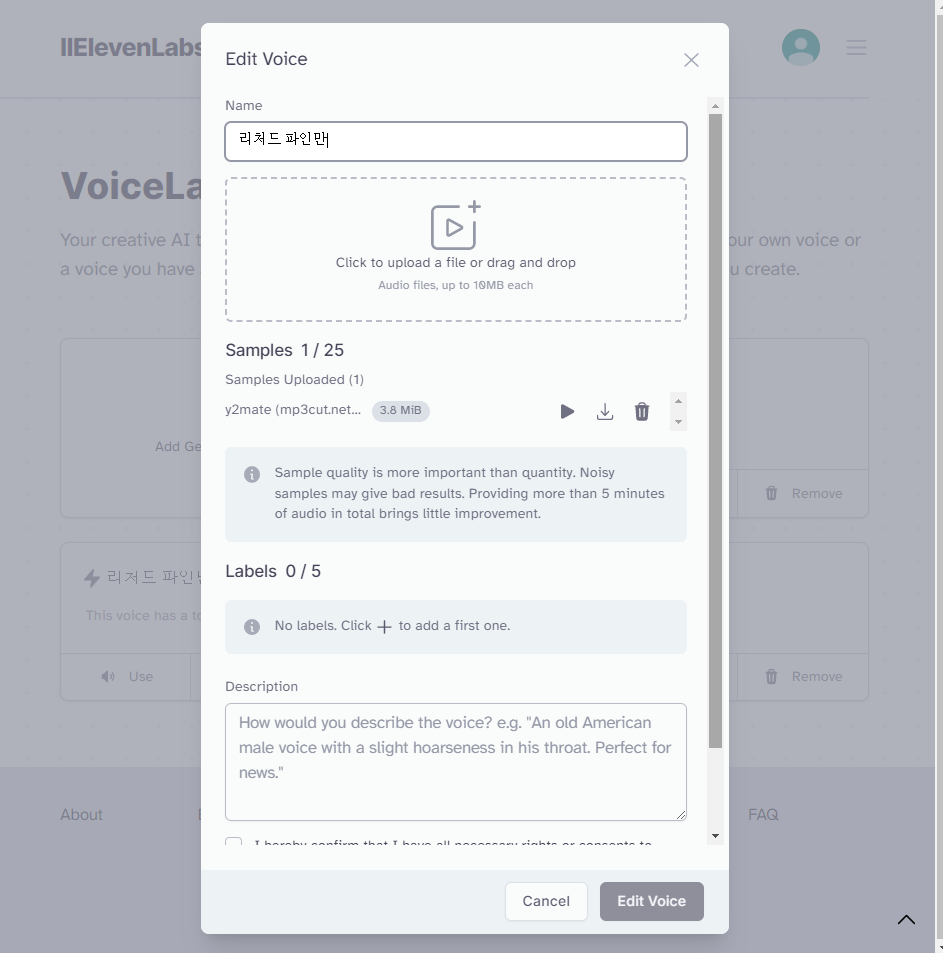 그 후 나온 창에서 다른 것은 굳이 하실 필요 없고 name에 지금 넣는 목소리 주인 이름을 적으시고, 아까 다운받았던 mp3 파일을 넣으시면 됩니다. (만약 영상이 너무 길다 싶으면 구글에 '온라인 mp3 편집기' 같은 것을 검색하셔서 길이를 조절하실 수 있습니다.)