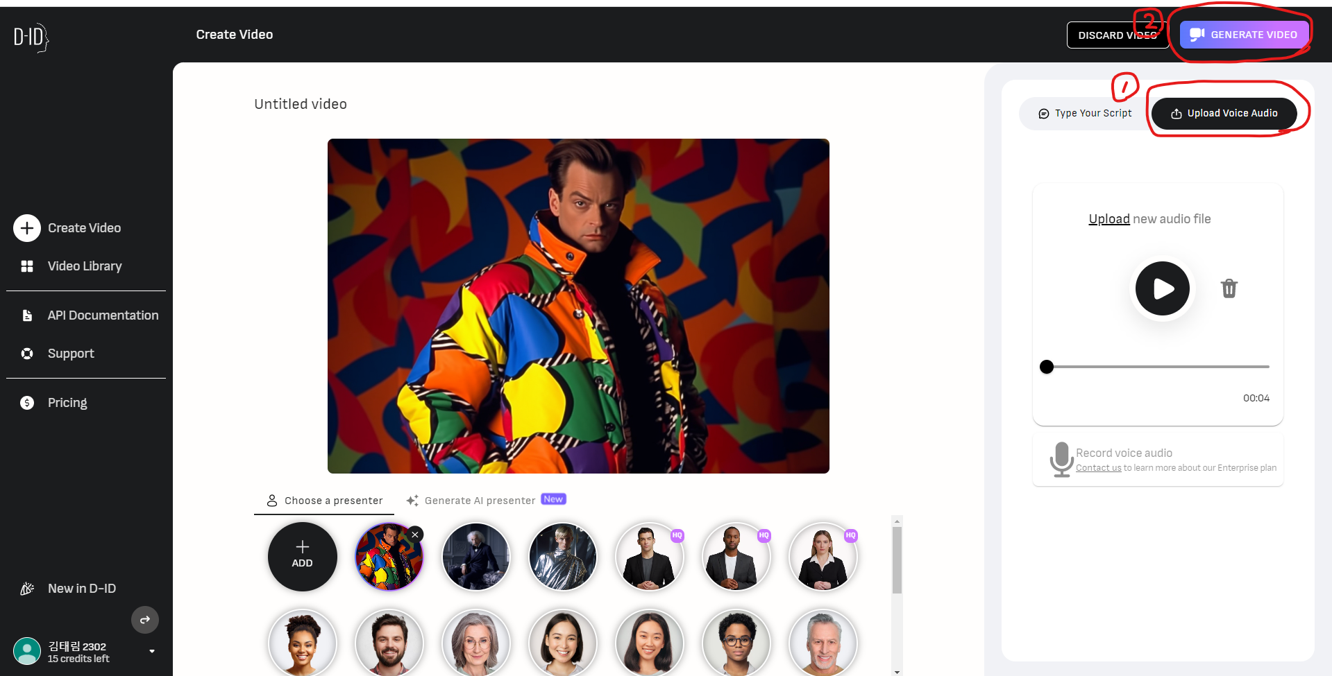 다름으로는 제가 1번이라고 체크해 놓은 부분을 눌러서 일래븐랩스에서 다운받은 파일을 넣으신 후에, 2번으로 체크해 놓은 GENERATE VIDEO를 누르시면 영상이 알아서 만들어집니다.
